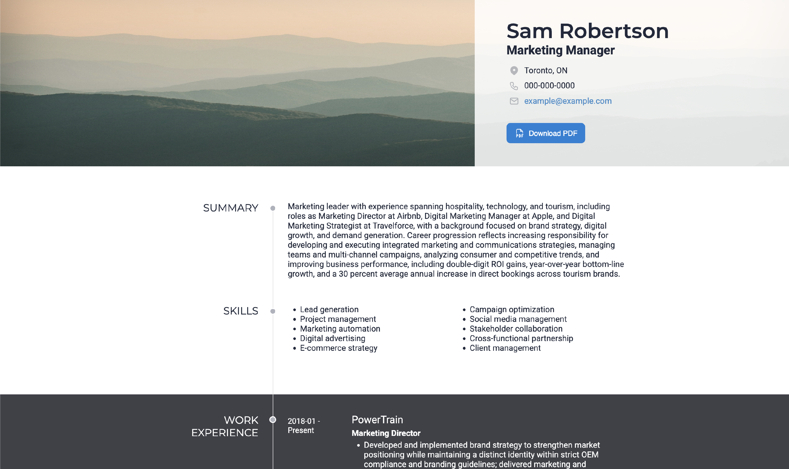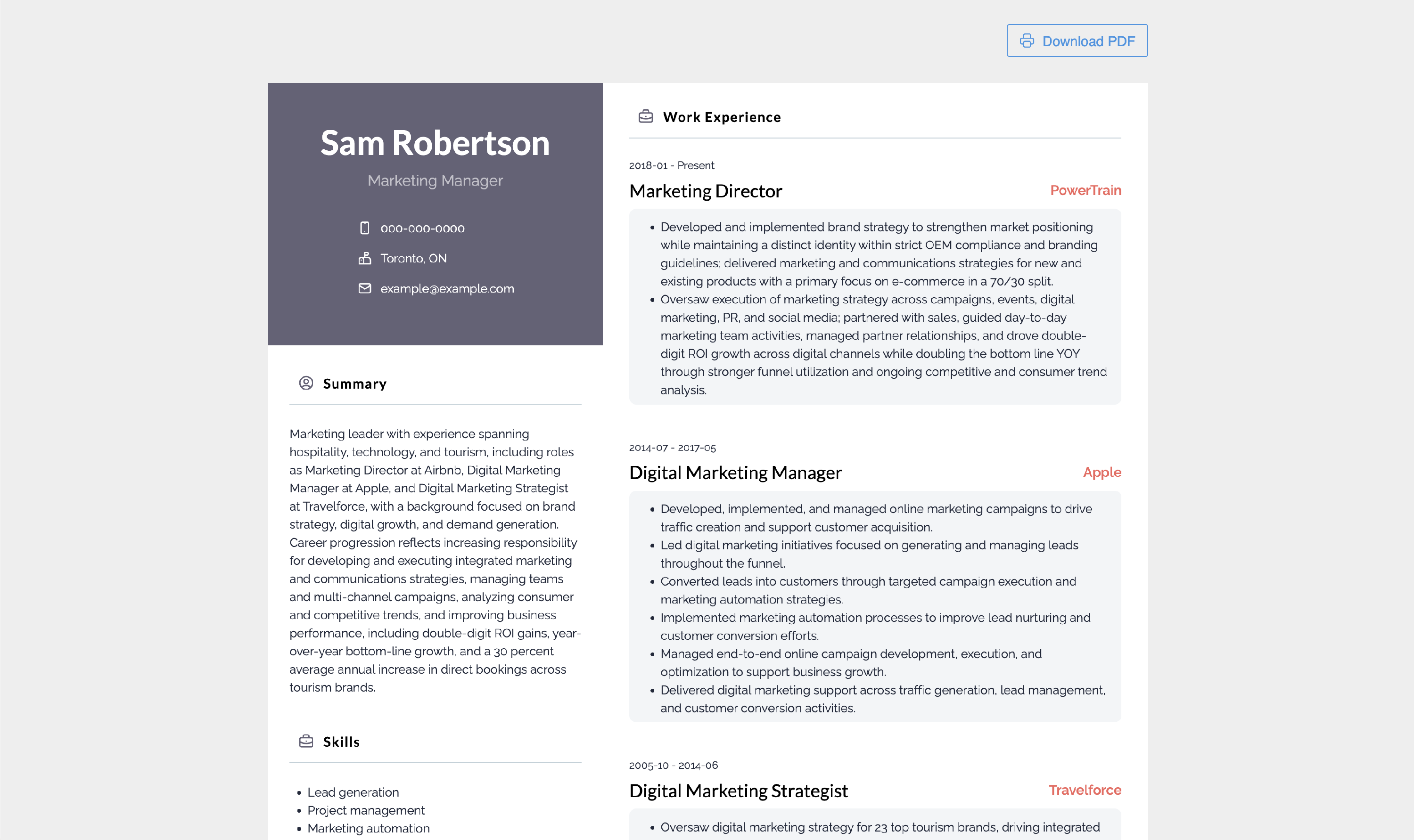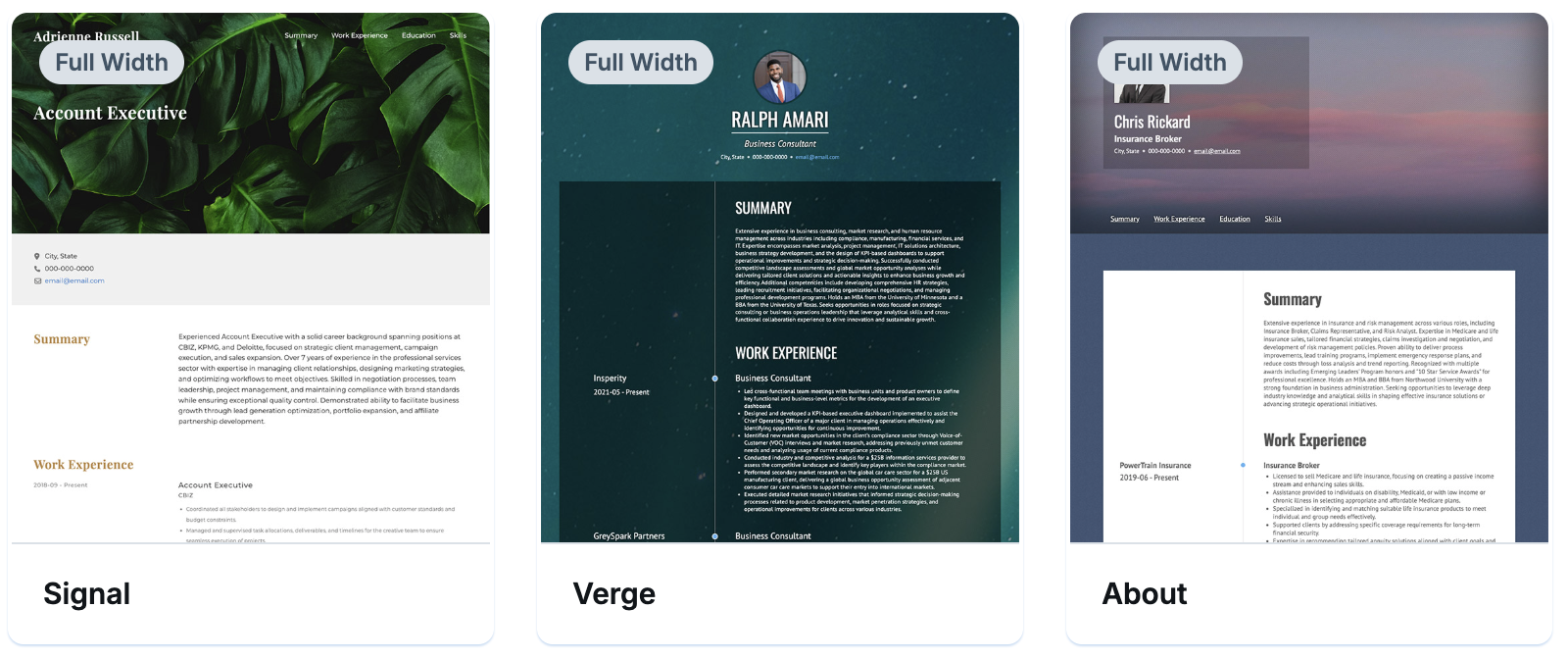 This tag shows that resumes using this template will use the entire width of the display window when the resume is shared online. In Full Width templates, the Download PDF button is integrated with the design of the resume.